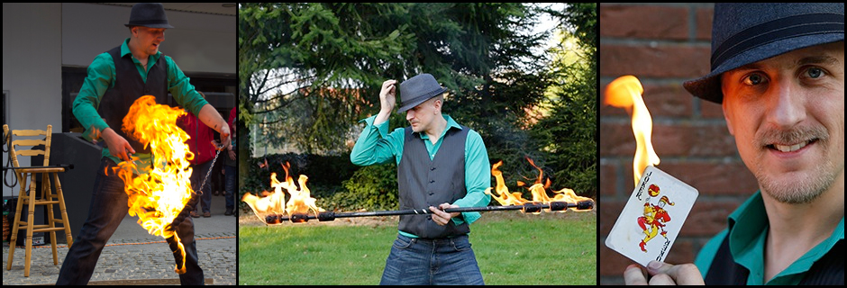 Seien Sie dabei, wenn der „Gambler“ sein Publikum durch unglaubliche Tricks mit dem heißen Element begeistert. Brennende Finger und entflammende Brieftaschen sorgen für offene Münder und ungläubiges Staunen. Kombiniert mit atemberaubender Feuerjonglage und immer mit einem kessen Spruch auf den Lippen versteht es der Spieler, die Zuschauer in seinen Bann zu ziehen und Groß wie Klein zu begeistern.